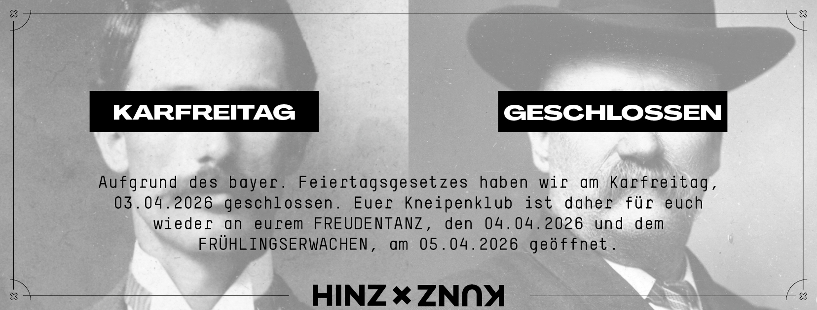 Aufgrund des bayer. Feiertagsgesetzes haben wir am Karfreitag, 03.04.2026 geschlossen. Euer Kneipenklub ist daher für euch wieder an eurem FREUDENTANZ, den 04.04.2026 und dem FRÜHLINGSERWACHEN, 05.04.2026 geöffnet.